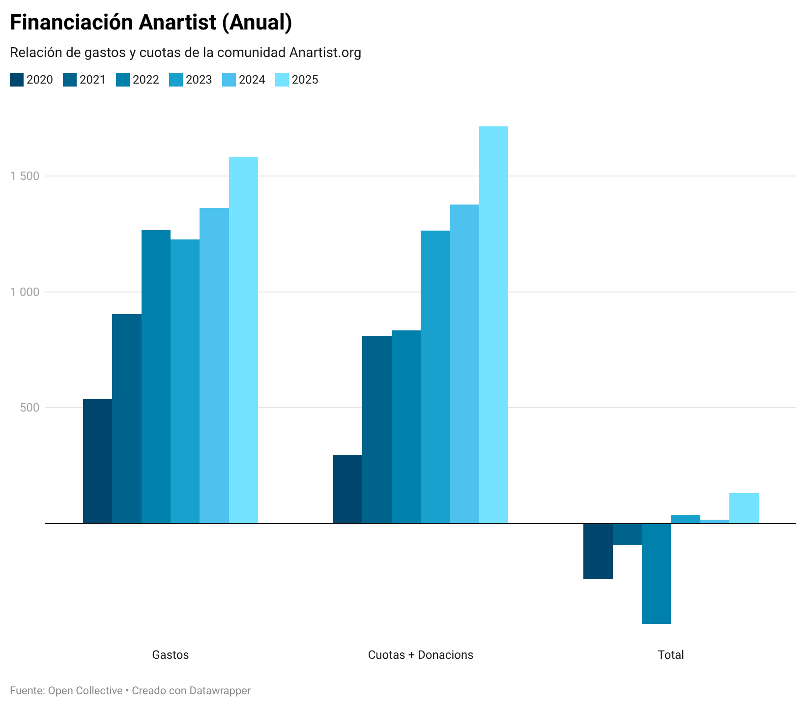 Es el tercer año que Anartist llega a ser 100% autosuficiente económicamente y el primer año que hasta cerramos con un poco de “beneficio”. Hemos podido ampliar los servidores aumentando el presupuesto de gastos de 1.361€ a 1.583€ y aún así hemos terminado con 131€ en positivo dejando la caja colectiva a 144€. ¿Que bién no?